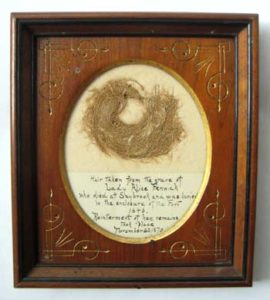 When it was clear that the railroad would be coming through, town citizens decided to relocate Lady Fenwick from Tomb Hill to Cypress Cemetery just up the street. When her remains were disinterred from her deep grave in 1870 and inspected by George Chapman, Robert Chapman and William Burrows, they found a disintegrated casket, but her skeleton was said to be intact (with the exception of a missing pinky joint). A lock of her hair was present and was cut into pieces and given to those attending the disinterment. Her hair, described as being auburn red, was more flaxen in color (perhaps a result of the age of the lock – it had been 225 years since her death when collected and 365 years since her death today?). The photo below right is a framed lock of her hair that is displayed at the Old Saybrook Historical Society. Her remains were laid out on a table in a home on College Street and then placed in a new coffin and carried to the