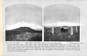 Lady Fenwick’s original grave site sat alone on “Tomb Hill” on the Connecticut River riverfront, approximately “40 rods” from the water (seen in photos at right and below left). That equates to a location that would have put her grave in the parking lot area by Old Saybrook’s Vicky Duffy Pavilion across College Street from the Saybrook Point Inn.
