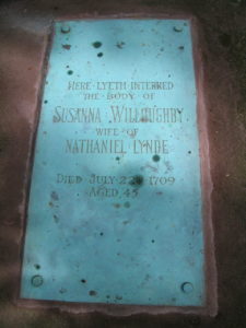 A second view shows the Lynde plot looking toward Lynde Point (the Borough of Fenwick) in the distance. He also ran the large and successful Lynde family farm located on Lynde Point (Borough of Fenwick) across South Cove. Nathaniel and Susanna also saw the death of their seven year old son Willoughby. His stone – or his footstone, anyway, is located within inches of his mother’s tombstone (adjacent to the tablet). the soil between the two stones, and some growing vegetation, had to be removed to see Willoughby’s name on the small slate stone. The other markers surrounding Nathaniel and Susanna are also Lyndes. The numerous small stones are those of deceased Lynde granchildren.