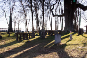 Nathaniel and Susanna Lynde are buried on this rise underneath a large tulip tree in view of their beloved Lynde Point across South Cove, also known as the Borough of Fenwick. To the left of the two tablets up by the large tulip tree is where young 4 1/2 month old Susanna is buried (see photo). Susanna was Nathaniel and Susanna’s first child; nine children followed after Susanna’s death. Although Saybrook colony burials no doubt occurred in the 50 years preceding the death of young Susanna, her 1685 marker is the oldest in Cypress. The lower tablet in the right foreground is that of Nathaniel and Susanna’s oldest son, Judge Samuel Lynde, who was an attorney, Judge of Superior Court and represented the town in the General Assembly for eleven terms and later the “upper house”, a position of which he retained until his death in 1754. He was a colonel in the militia and was one of the “guardians” of the Mohegan Indians. Judge Lynde’s first two wives, Rebecca and Lucy, are buried in Cypress while his third wife, Hannah, who survived him, is not.